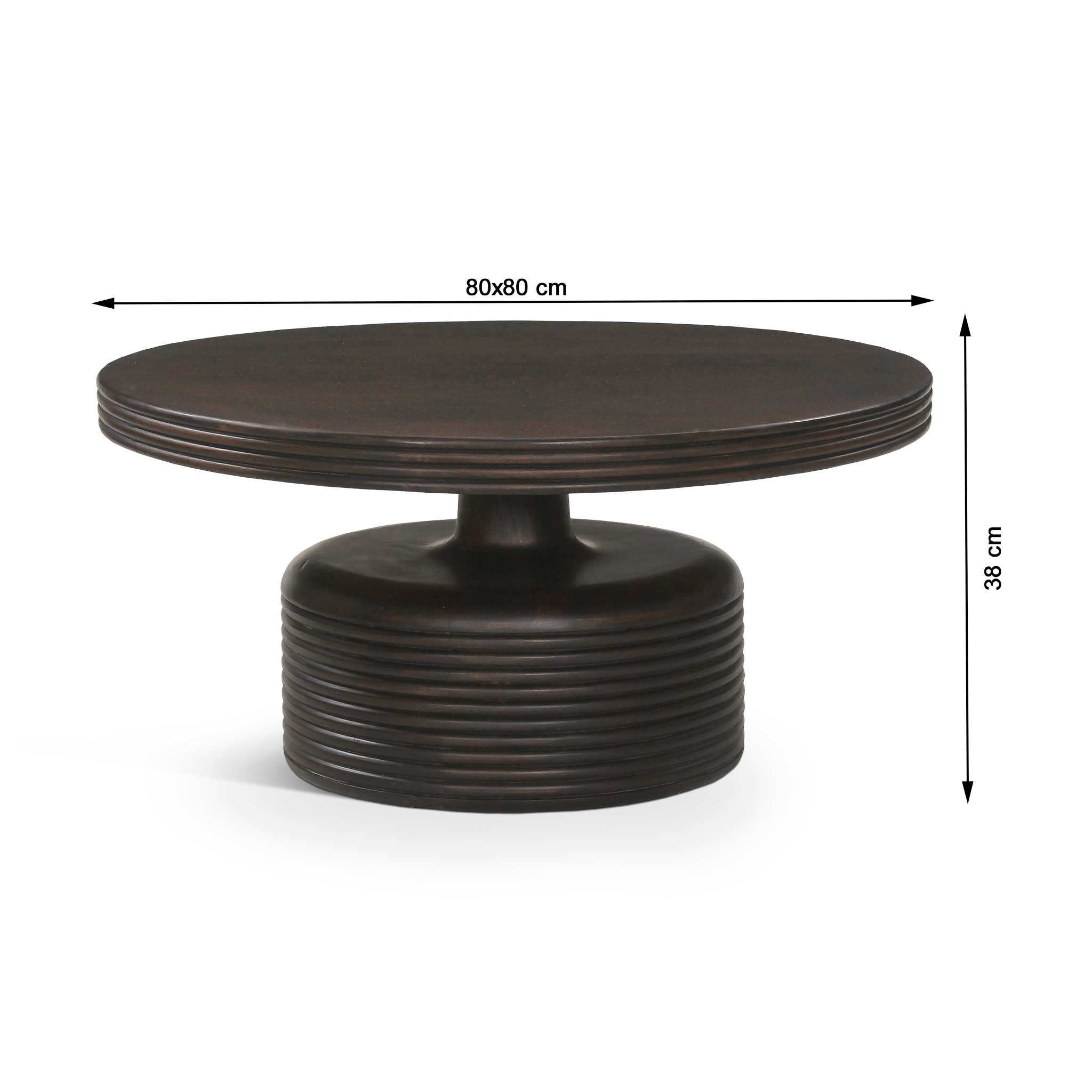 The CRAVEY Coffee Table features a round silhouette crafted from solid mango wood with a rich walnut finish. Its sculptural pedestal base and layered detailing create a strong visual presence while maintaining a balanced, compact form.