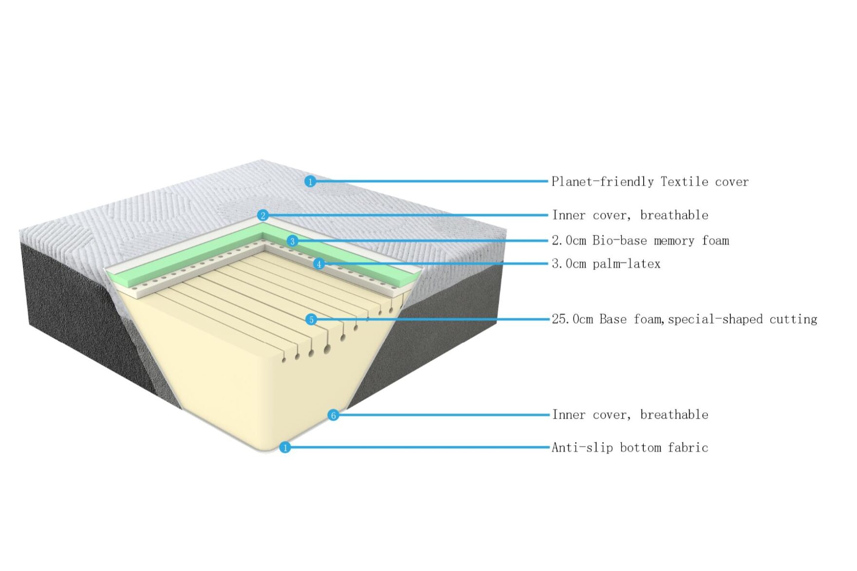 bio-base memory foam (biodegradable, comfort level: Medium soft, hypoallergenic and temperature regulating), Mattress thickness 30cm, palm-latex foam, roll up mattress, soft feeling