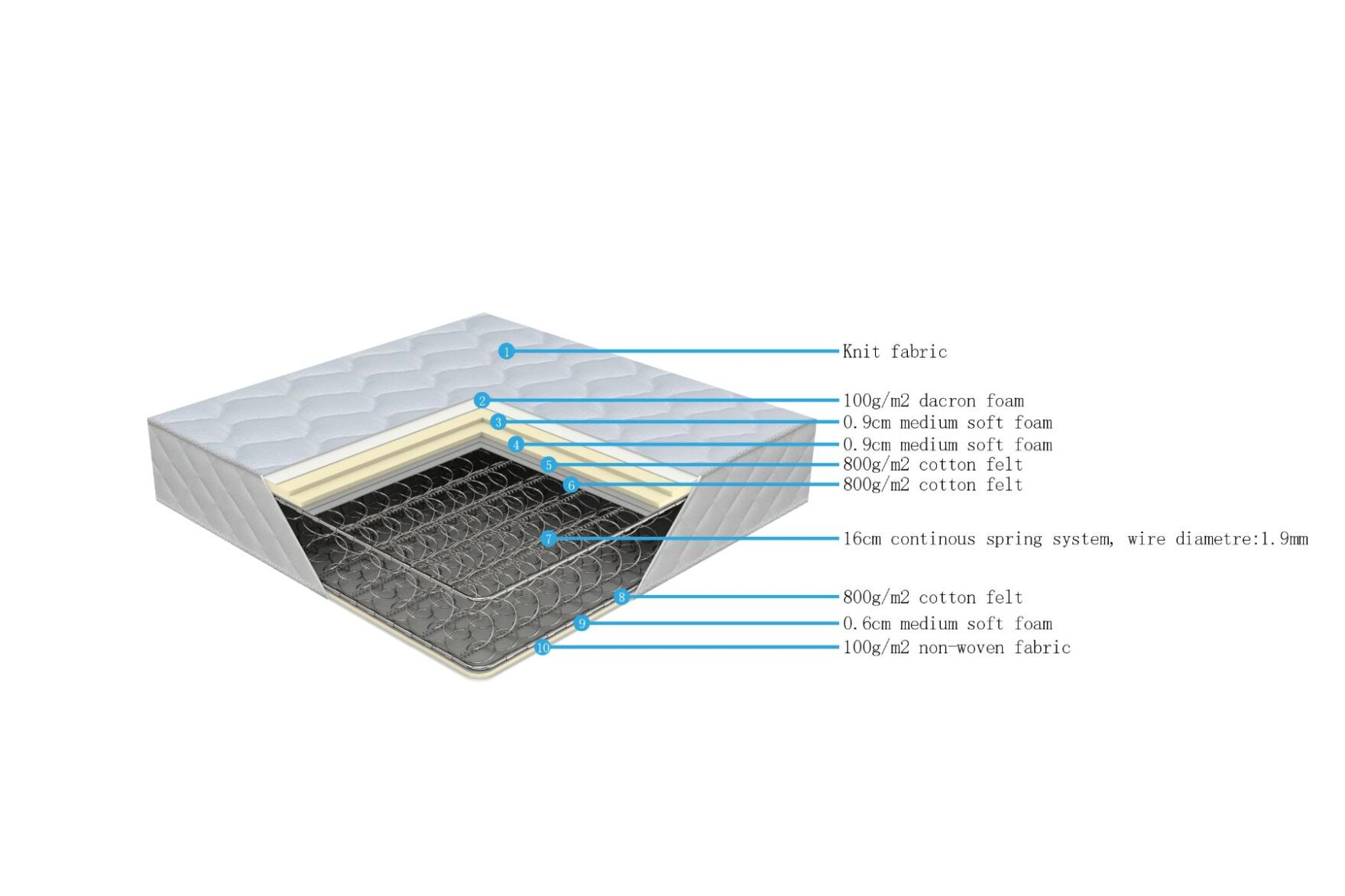 - 16 cm continuous spring system (wire Ø 1.9 mm) guarantees firm, long-lasting structure.