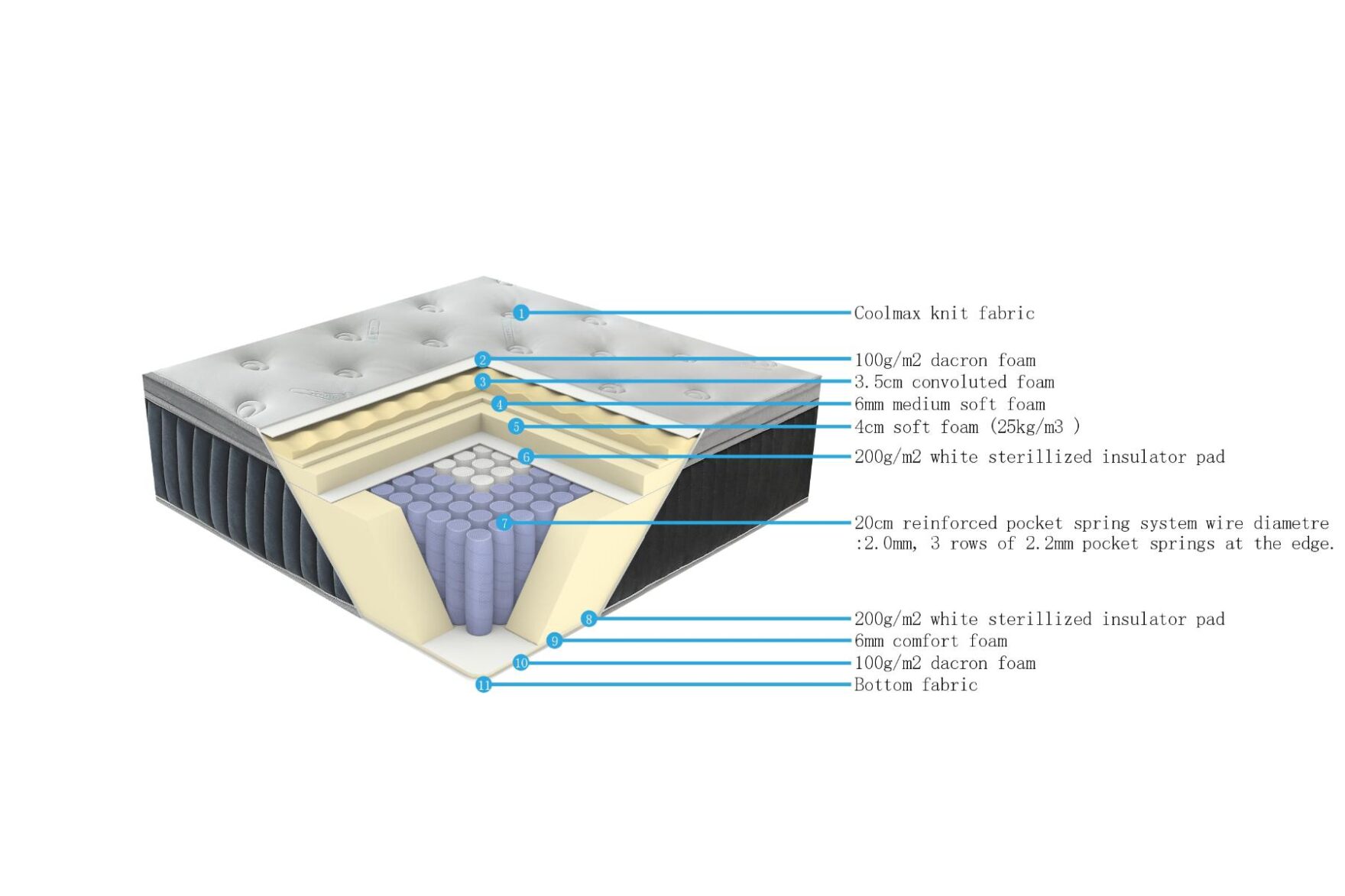 - Ενισχυμένο σύστημα pocket springs 20 εκ. – σύρμα διαμέτρου 2.0 mm, με 3 σειρές 2.2 mm στις άκρες για μεγαλύτερη αντοχή και στήριξη περιμετρικά.